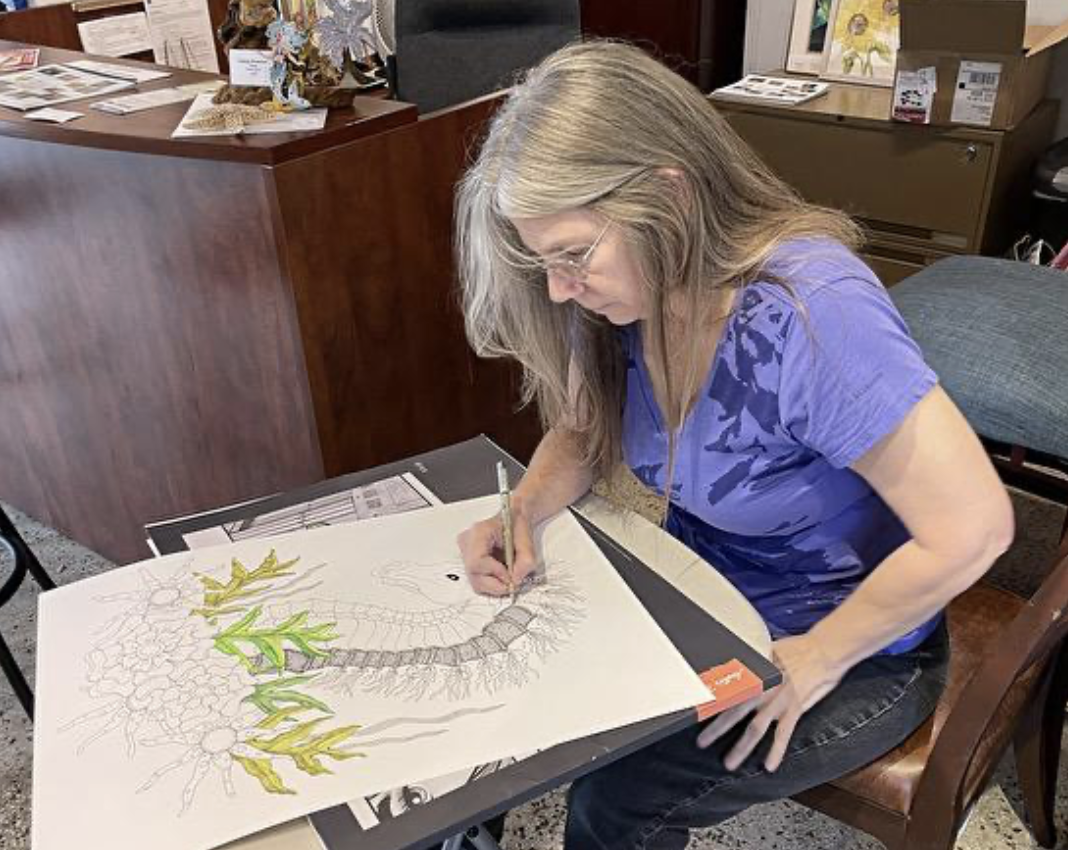 Dive into the vibrant world of Patty Duffy, a Certified Zentangle Teacher and award-winning artist who transforms Florida’s wildlife and sea life into whimsical creations! Her art blends anatomically correct(ish) forms with bold, vibrant colors, intricate repeating patterns, and delicate shading to create pieces that sparkle with life. Using translucent inks and fine-tipped pens like Sakura Pigma Microns, Patty handcrafts each large-scale drawing over months, often weaving hidden words of love and affirmation into her designs for an extra touch of magic. Originally from New England and now thriving in Indian River County, Florida, Patty’s lifelong passion for making marks on paper comes alive in her sunny studio. Her iconic piece, Big Papa Kevin the gator, stole hearts and snagged an award at the Cocoa Beach Juried Art Show, proving her knack for turning nature into art that captivates.